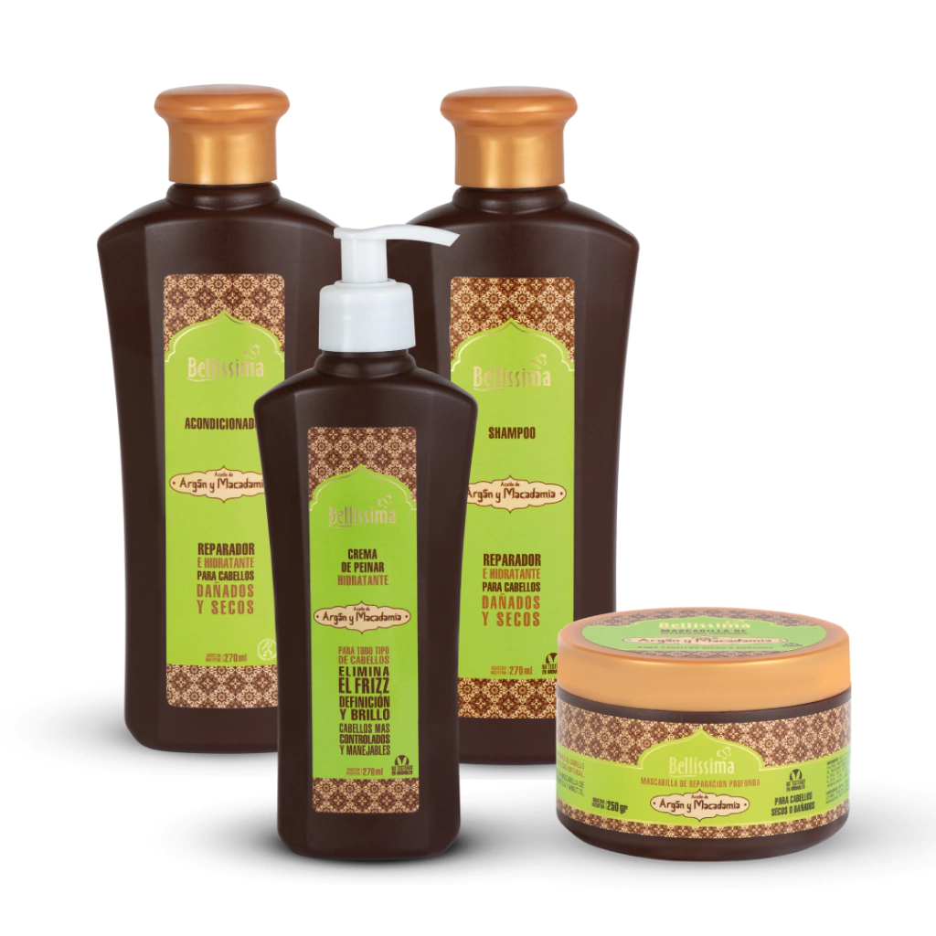 El Aceite de Argán es reconocido por su alto contenido en ácidos grasos esenciales, Omega 6, vitamina E y por sus características tiene la capacidad de restaurar la humedad, la elasticidad del cabello devolviendo el brillo; al mismo tiempo que el Aceite de Macadamia posee propiedades calmantes y nutritivas, y un excelente efecto antifrizz